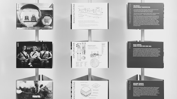 The triads expand when rotated through the use of a cam mechanism and snap into place. Each story is displayed on a single triad with a strong central image, a brief overview, and a fact-based diagram or info graphic. The team settled on the triangle as the basic building block to reveal the stories in a non-linear way.